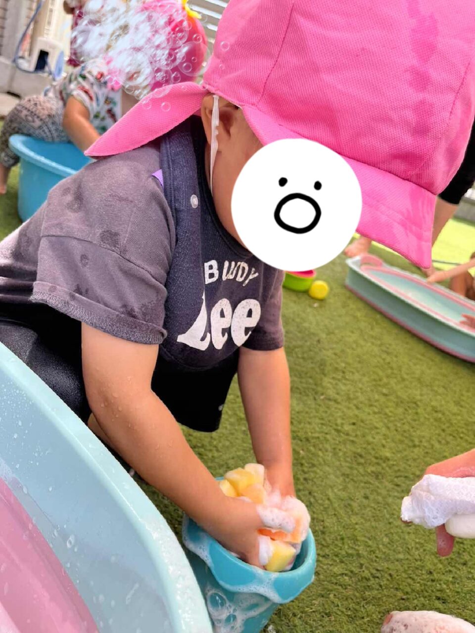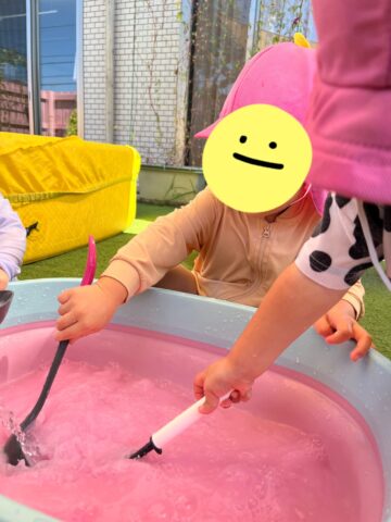 泡遊びやしゃぼん玉、色水、洗濯ごっこなど、子ども達の好きな遊びを盛り沢山でやっていますよ😌